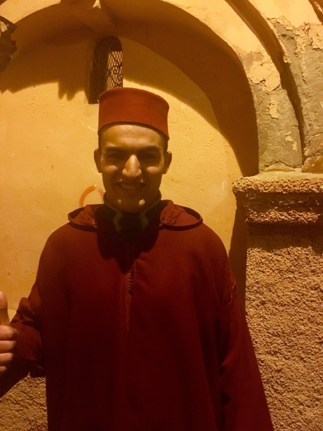 Hussain came to the Riad to pick me up about 6:30 on Christmas night. He wore a robe the colour of port wine and a matching fez. Real ‘wise man’ attire. We walked past the mosque and through dark, uneven, narrow passages and talked easily in a mix of French and English. He’s 25, a Berber from the Sahara, and in Marrakech to work. One of his duties at Dar Zellij is to meet would-be diners and guide them to the restaurant. The roads are too narrow for traffic, and the zig zags in the Northern Medina would be impossible to navigate in the dark. When we reached the restaurant he stepped backwards into the shadows. “Ask for me when you want to go”.
