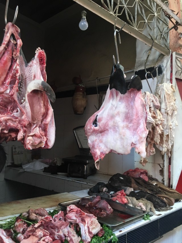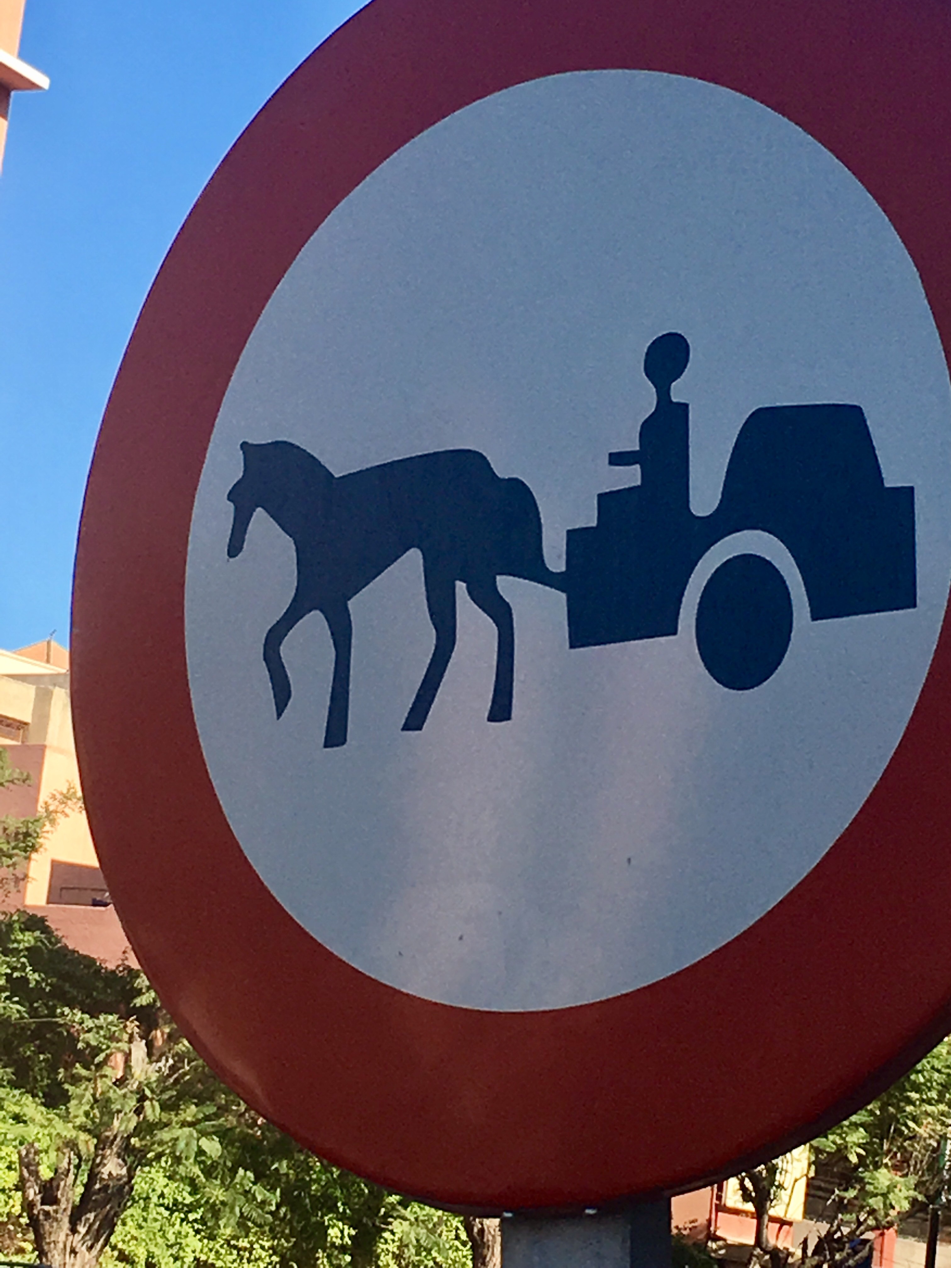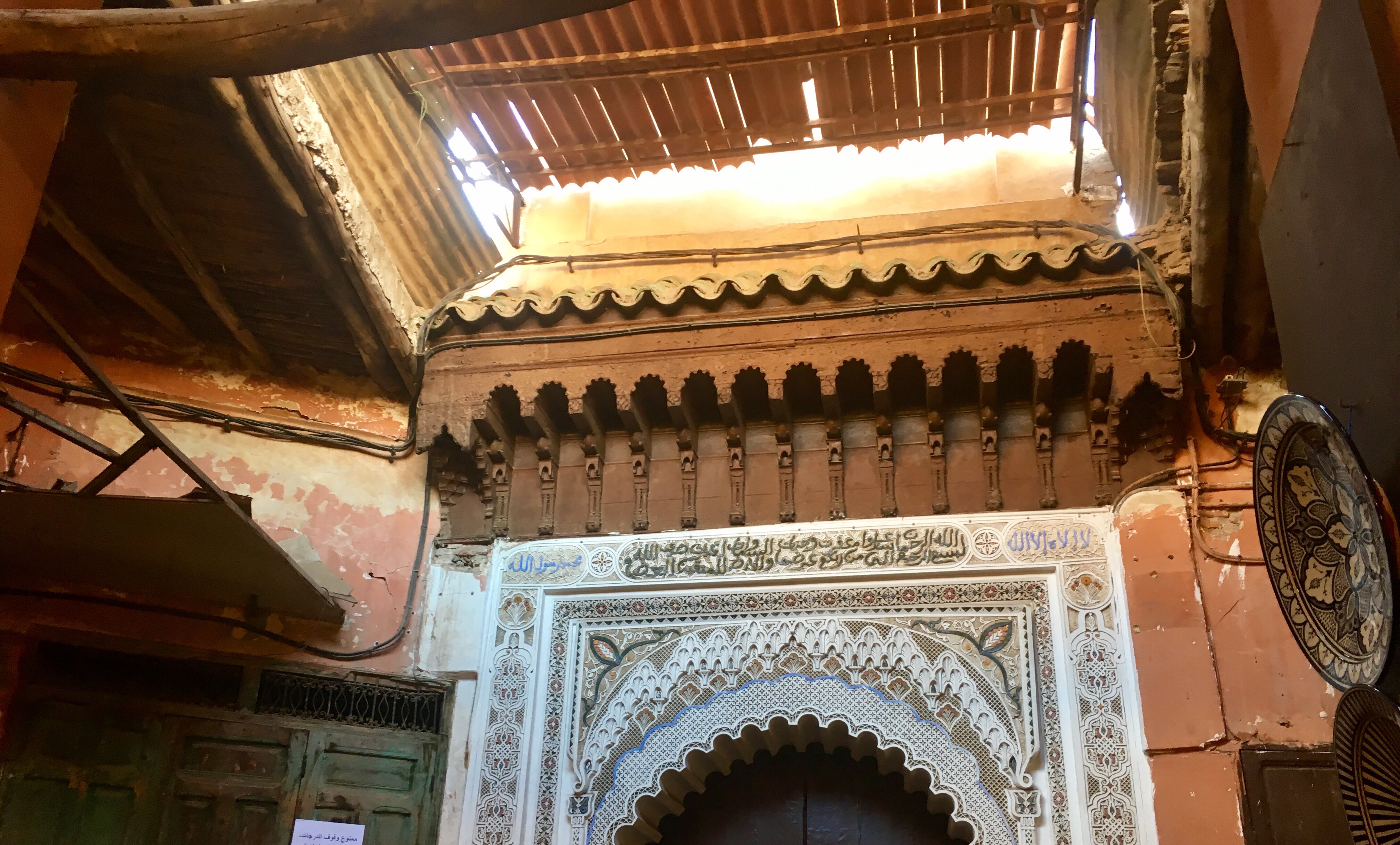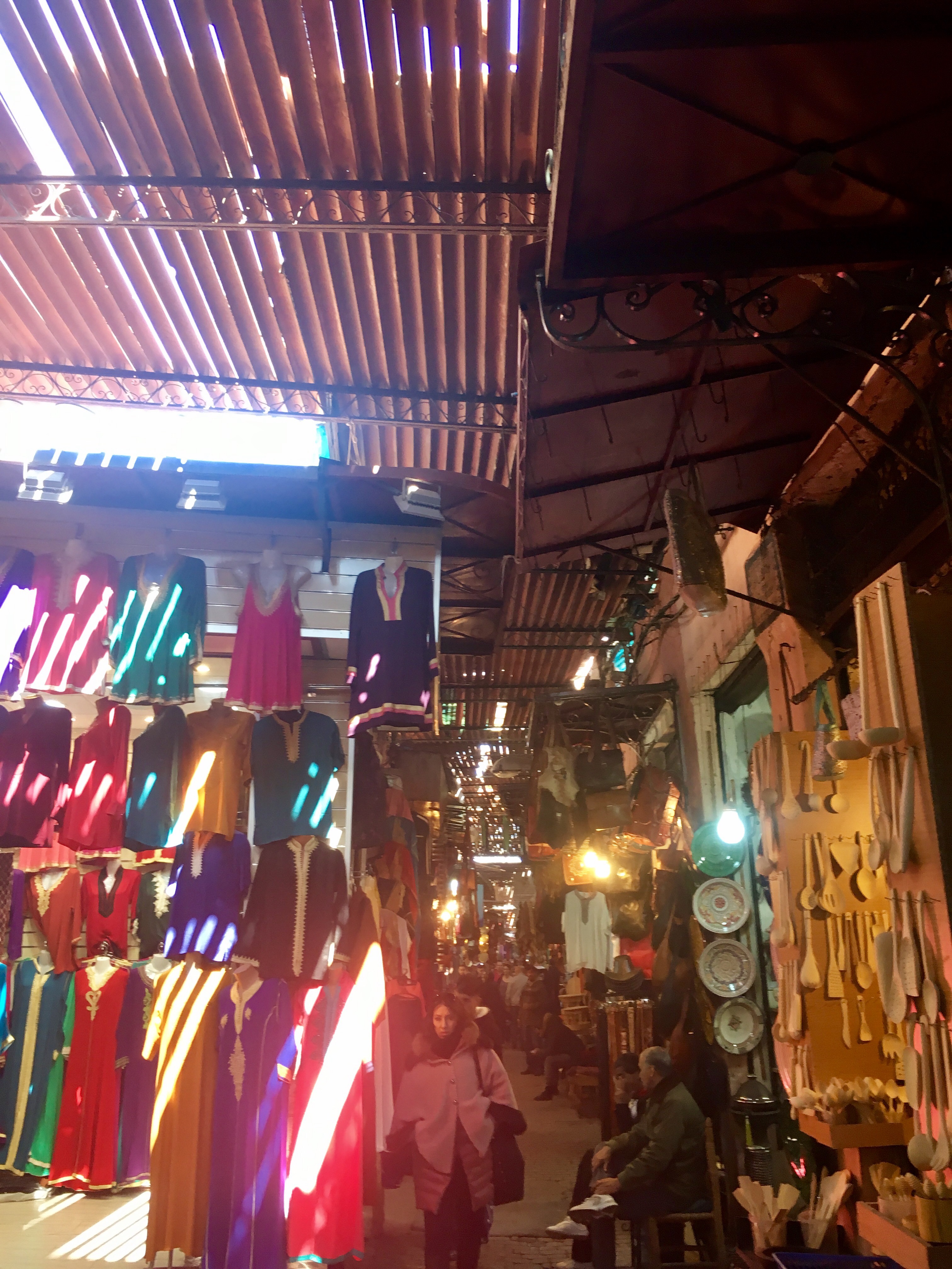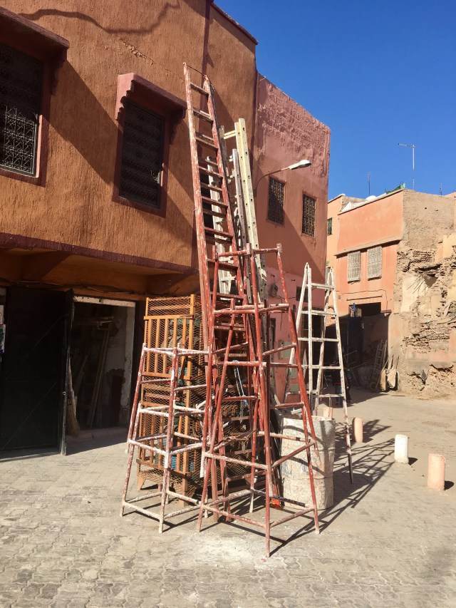 My beautiful Riad is in the northernmost part of the Northern Medina, close to a launderette, a number of scooter repair shops, some foundry workers and an Islamic saint’s tomb which non- Muslims are not permitted to enter. The riad’s rooms are gorgeous, the service friendly and the hot water plentiful. The breakfast includes crepes with honey and lemon, and bread with homemade orange marmalade, fresh orange juice and coffee. Today I also got two fried eggs. Every day starts well, but I go to bed hungry more often than not. The Riad has only a small number of rooms and only a few are filled at this time of year. Although their website boasts a restaurant and room service, any evening meal would have to be ordered a day in advance. While sitting alone in a busy restaurant is something I enjoy– the perfect combination of eating and people watching– it would feel a bit bleak to hurry home at night for a lonely tagine in a dark and deserted courtyard. If I were better organized, I would buy bread and oranges while out and about, and supplement those with dates or figs and nuts. If I were more energetic and less stingy I would book a central restaurant and cabs and go out every evening at 8pm. In fact, I walk home as it gets dark about 6pm, rest my aching legs, and then decide that going out again is too much trouble, for no restaurants are walkable from where I am staying. For this reason I recommend accommodations closer to the action in the Medina when you come to Marrakech. The rest of my tips may be useful only to other middle aged white women with bad knees but I share them here nonetheless:
