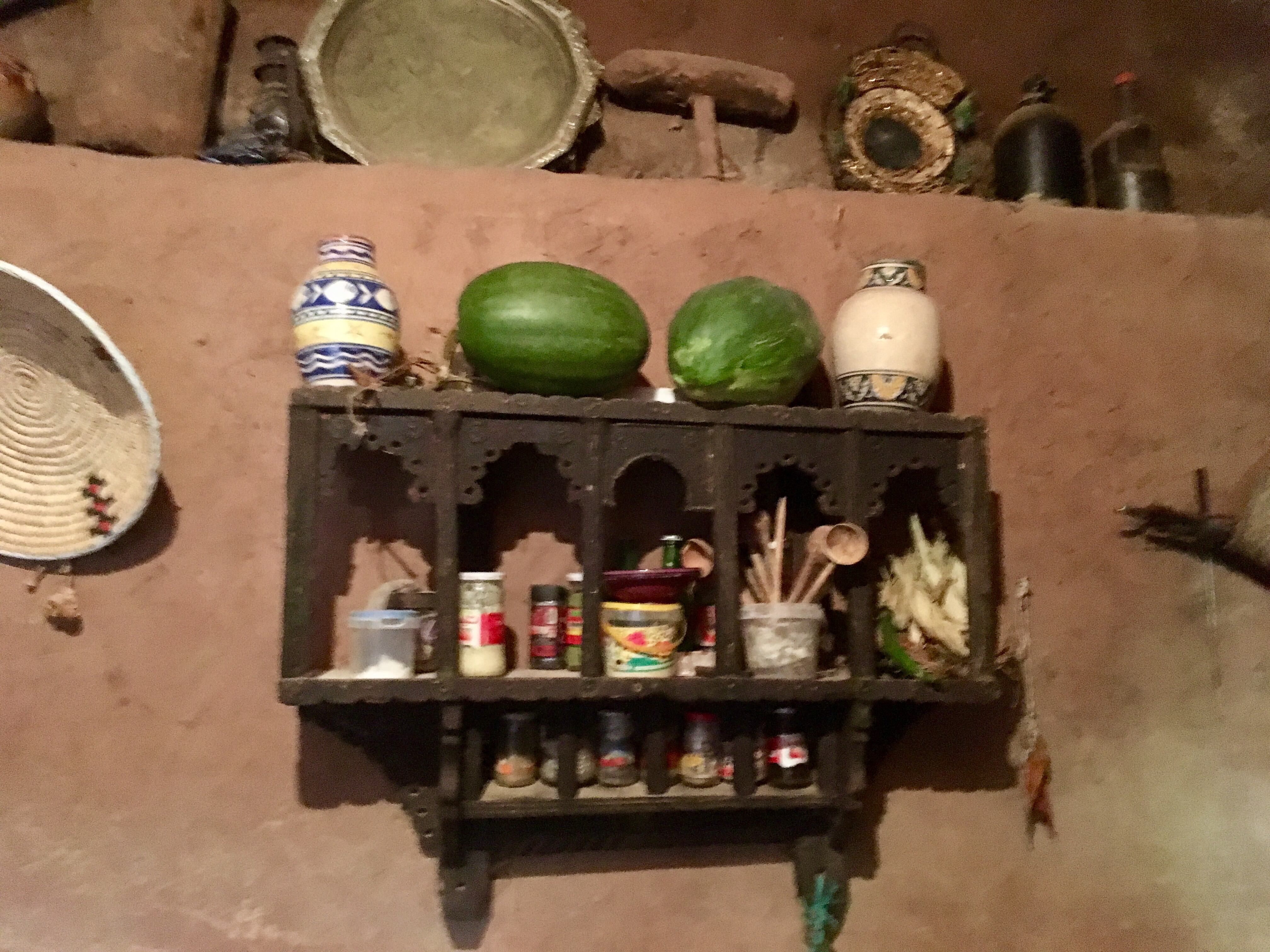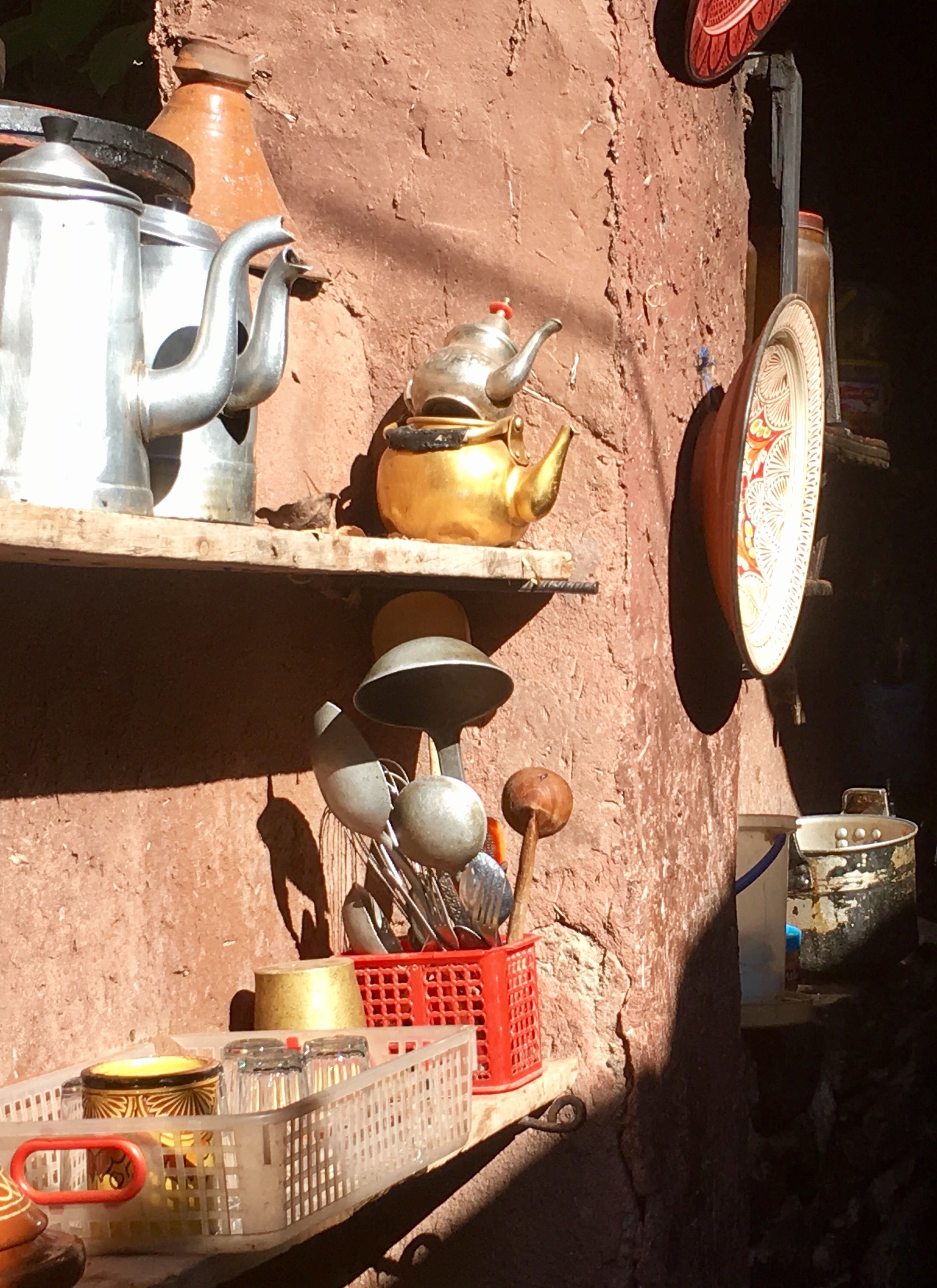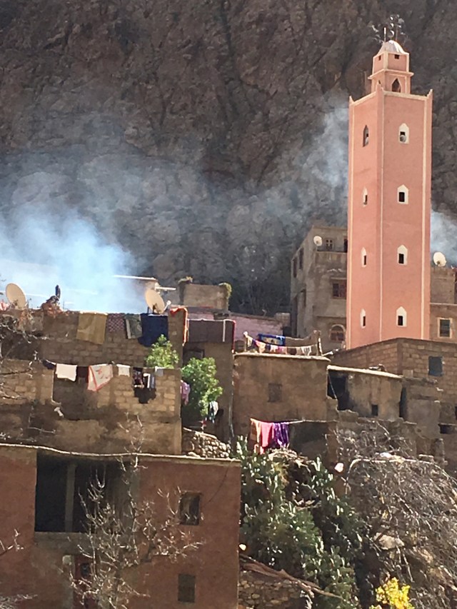 Our next stop though was a Berber house (earthenware and textile shop attached, natch) and if they did have internet they hid it very well. There was electric light but cooking was done on an open fire, and the sink was a hole in the stone, filled by a hose running from a mountain stream. It was a little too real to be dismissed as a folk museum. There was one dirty sock on the bedroom floor and a well worn pair of wedge flip flops by the bed. The toilet was Western. That house had no satellite dish, but many do. Today we saw remote Berber villages where flat roofed houses clung to sheer rock face. Satellite dishes were the second highest structures in each hamlet, just below the crescent and orb on top of the mosque. The Berbers are such polished and accomplished people, with a long history of entrepreneurship that it is almost impossible to believe that they are as poor as they look. I like to fantasize (when bargaining for frou) that they have villas in Marbella and pied a terres in the Portobello road and are buying and selling us all. This picture fades though when you see a young woman toiling along under an unfeasibly large pile of sticks tied to her back with a sheet, or a rag bag Grandma working a small scythe in unkind dirt. Where the tourists stop, there will always be someone who can charge your iPhone via the computerized restaurant till. But right next door there are also desperate-eyed men selling second hand trainers (tennis shoes) in children’s sizes from the back of a donkey cart. No USB there. Morocco has just unveiled the world’s largest solar power plant in the Sahara desert–it will provide electricity for more than a million people. Huge innovation that surely must change communities where people still grind argan nuts by hand, and stand in the street winding twine to hand-sew shoes.