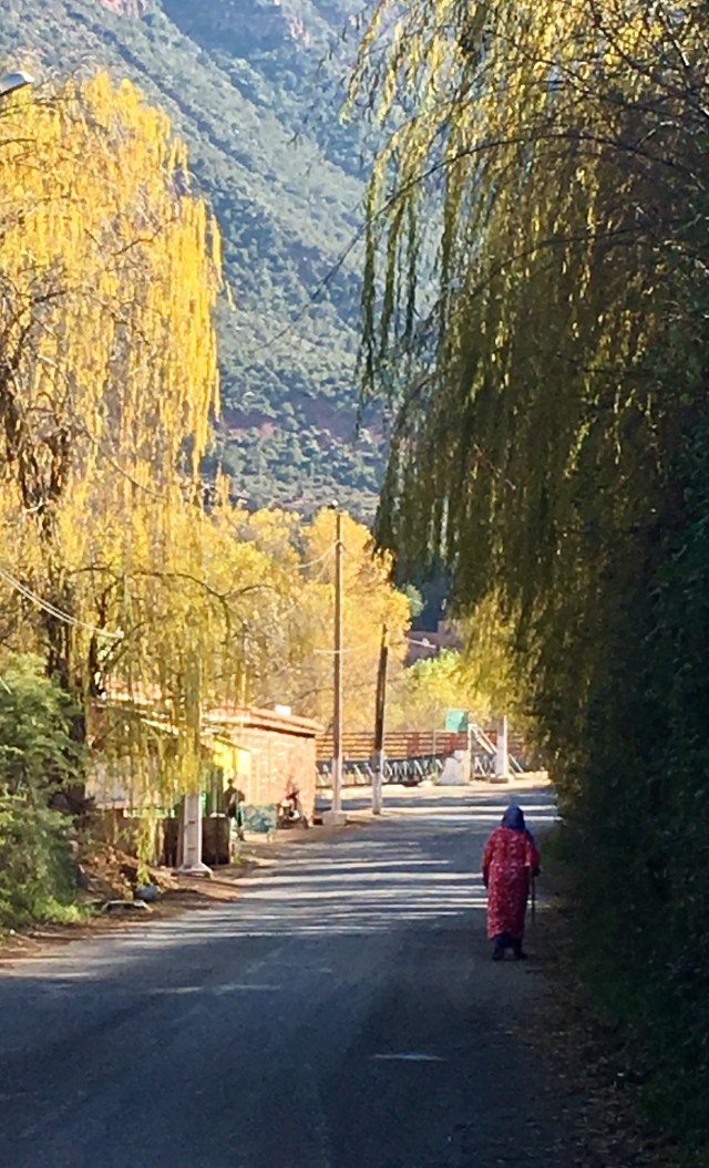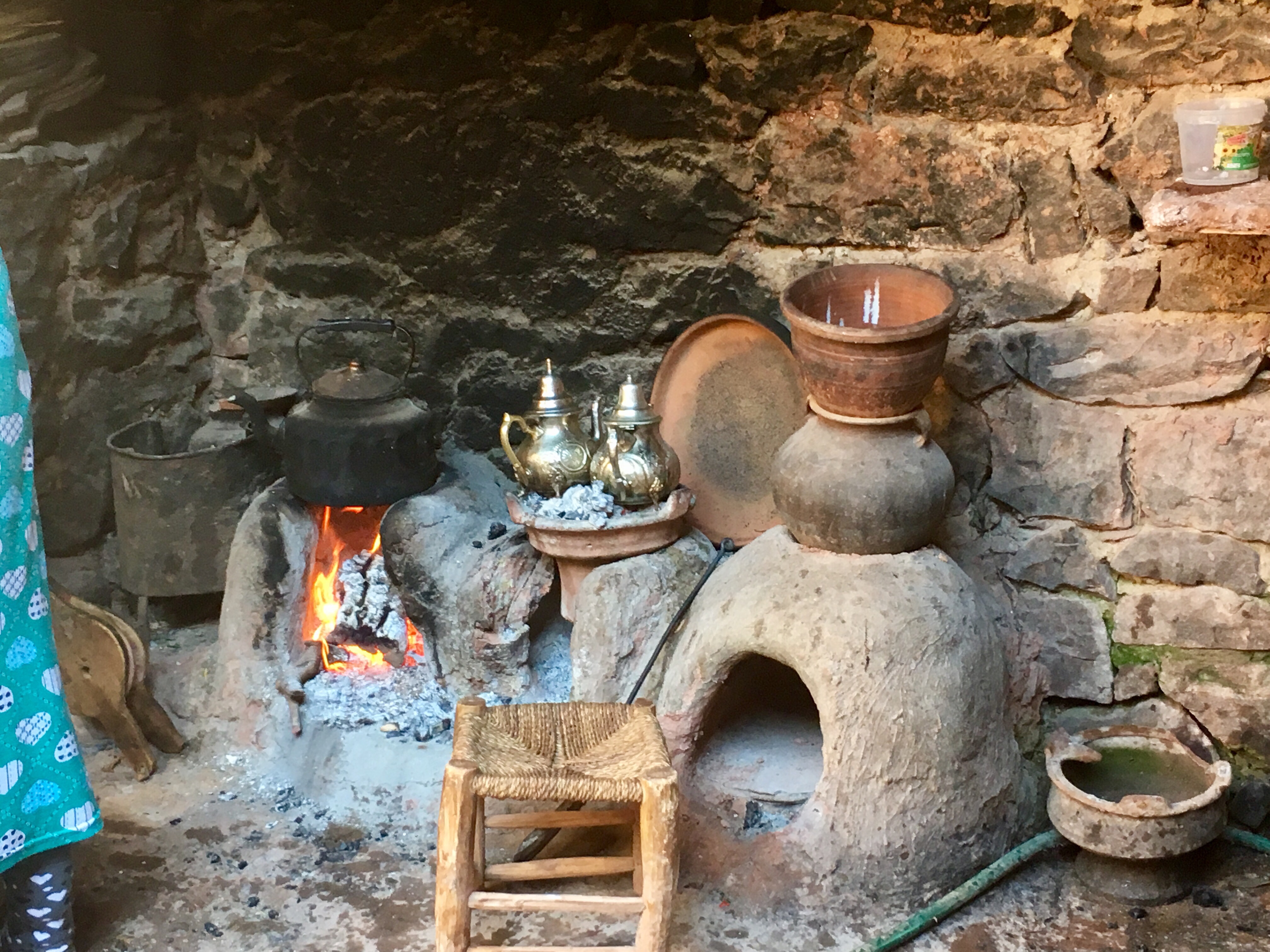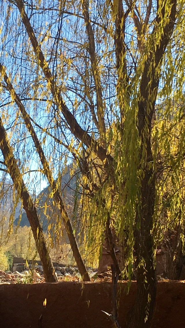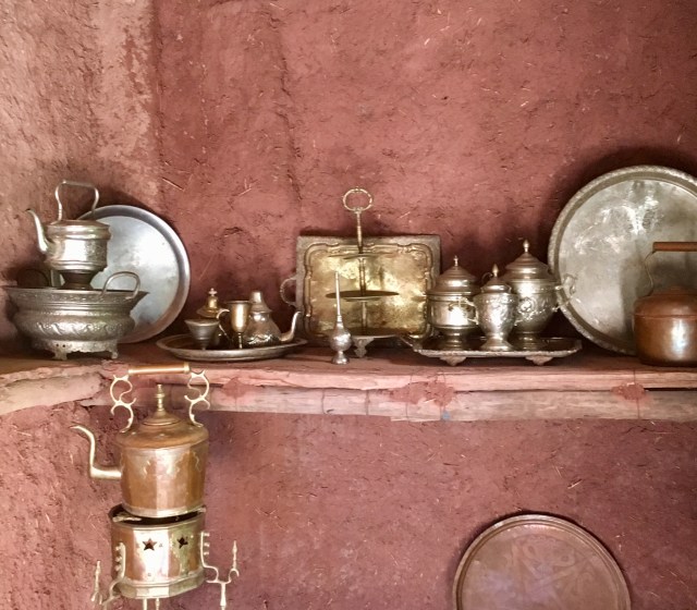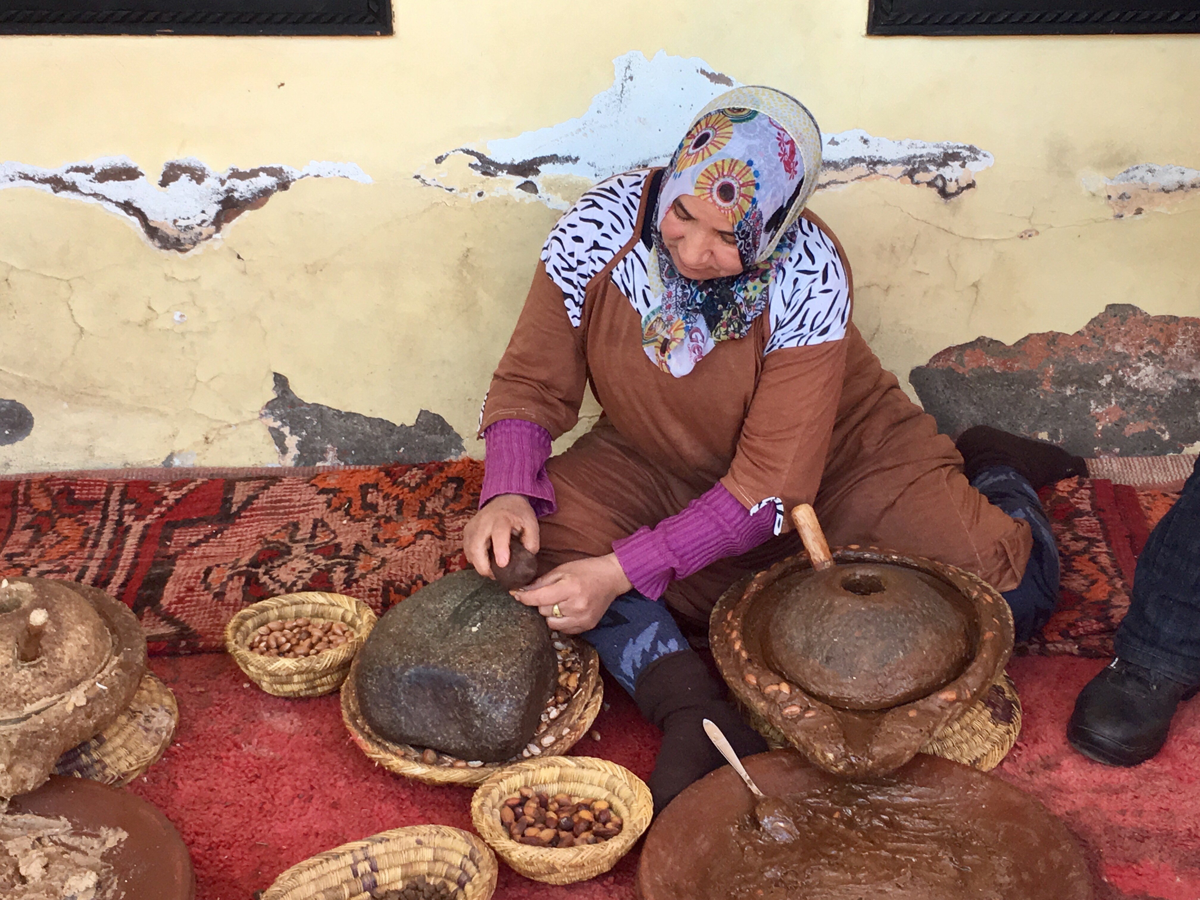 Our next stop though was a Berber house (earthenware and textile shop attached, natch) and if they did have internet they hid it very well. There was electric light but cooking was done on an open fire, and the sink was a hole in the stone, filled by a hose running from a mountain stream. It was a little too real to be dismissed as a folk museum. There was one dirty sock on the bedroom floor and a well worn pair of wedge flip flops by the bed. The toilet was Western. That house had no satellite dish, but many do. Today we saw remote Berber villages where flat roofed houses clung to sheer rock face. Satellite dishes were the second highest structures in each hamlet, just below the crescent and orb on top of the mosque. The Berbers are such polished and accomplished people, with a long history of entrepreneurship that it is almost impossible to believe that they are as poor as they look. I like to fantasize (when bargaining for frou) that they have villas in Marbella and pied a terres in the Portobello road and are buying and selling us all. This picture fades though when you see a young woman toiling along under an unfeasibly large pile of sticks tied to her back with a sheet, or a rag bag Grandma working a small scythe in unkind dirt. Where the tourists stop, there will always be someone who can charge your iPhone via the computerized restaurant till. But right next door there are also desperate-eyed men selling second hand trainers (tennis shoes) in children’s sizes from the back of a donkey cart. No USB there. Morocco has just unveiled the world’s largest solar power plant in the Sahara desert–it will provide electricity for more than a million people. Huge innovation that surely must change communities where people still grind argan nuts by hand, and stand in the street winding twine to hand-sew shoes.
