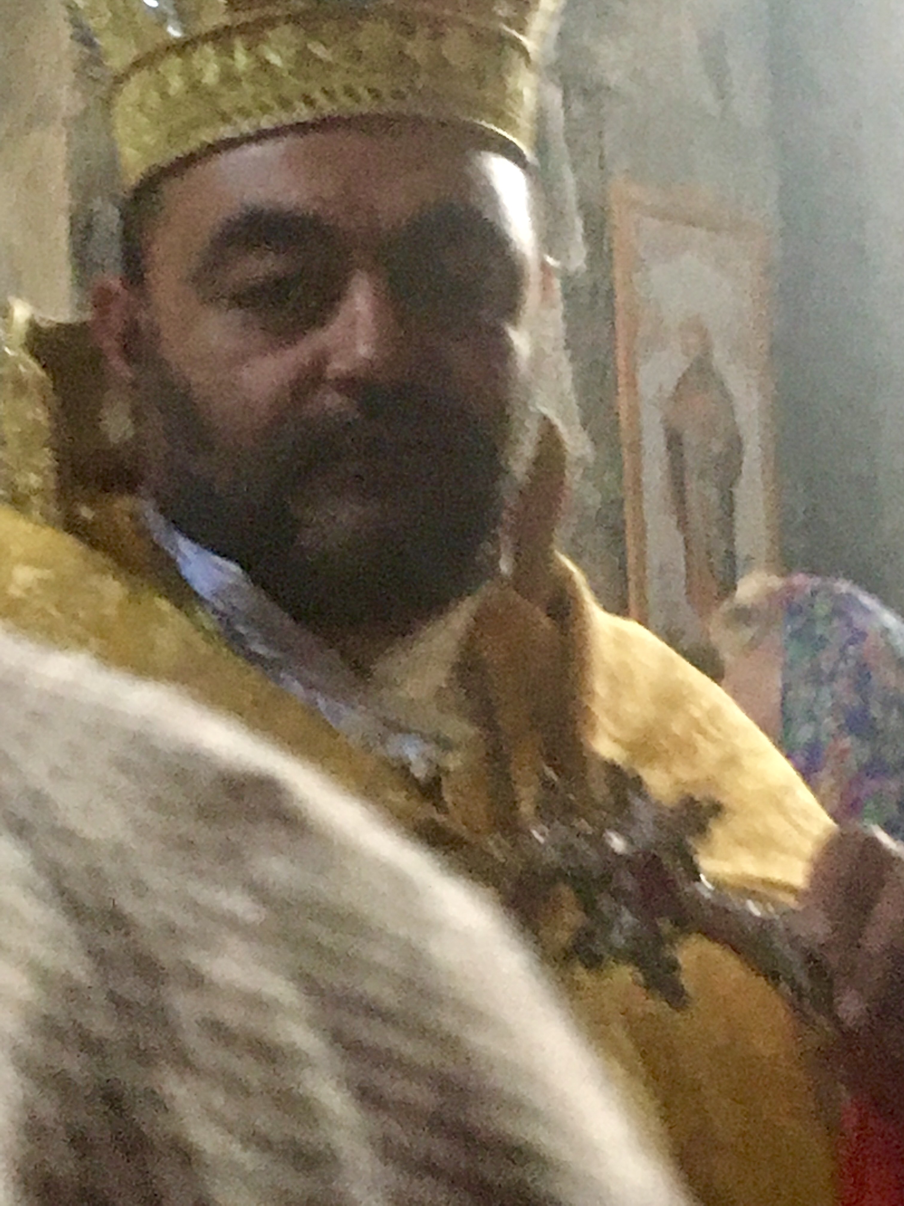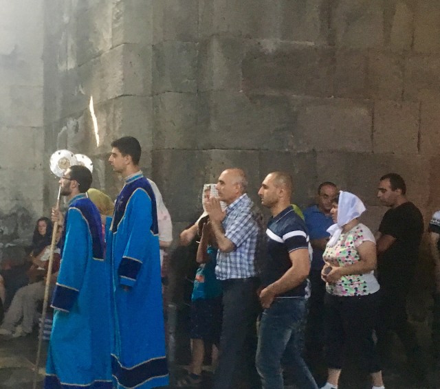 The priest, now without his gold hat, gold cape and gold Elvis-style collar came and sat beside us, as did one of the spear carriers, now minus his royal blue surplice. The spear carrier spoke some English. The priest, a man with the look of Demis Roussos, was wearing all black accented by a silver-colored cross both enormous and ornate. Lilit’s cousin, our ride home, called her to see where we were. We exchanged hugs and kisses with half a dozen people round the table and friended a couple on Facebook. I have Anahit’s number and instructions to call her when I am next in Artashat. Anush Lini. Let it be sweet. It was.