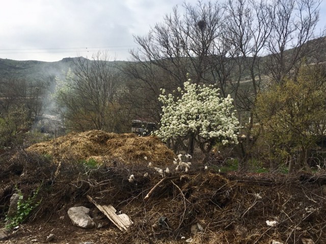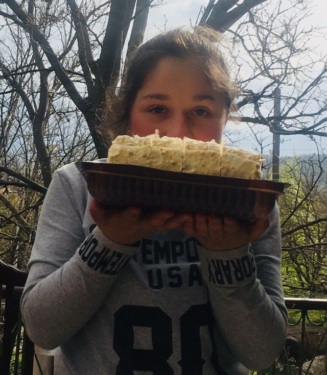 We sat outside Heghine’s mom’s kitchen door and had cake and peach juice. Heghine’s mom didn’t seem at all surprised to find an American stranger speaking English in her back yard. She made me a cup of coffee. The view, the company and the food were all delightful. The girls picked some narcissi and tulips for me and went back to their game. Class. It’s overrated.