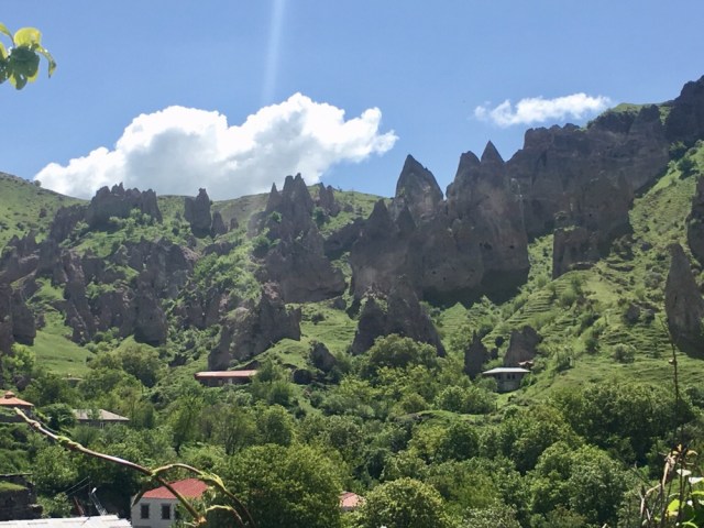 When I first arrived in Armenia–and even in Goris–I saw ugliness everywhere–scrap metal cars abandoned in hedgerows, cinder-block buildings half-finished, and trash dumped by the side of the road–weeds growing between broken paving stones. Those things are still there of course, but my lens has softened. Now I see the beauty of the green fields off-setting the blue of the mountains on a village road I hadn’t traveled until today. I admire the cherries in picture-book bunches piled high in the shops, and eat a kilo at every sitting. I am pleased to discover that the Armenian word for gossip is onomatopoeic–bambasank. Բամբասանք.