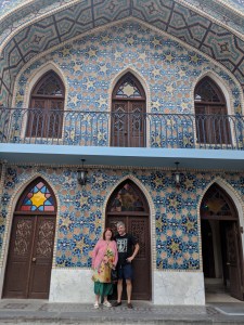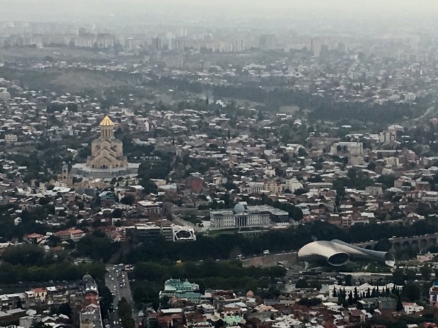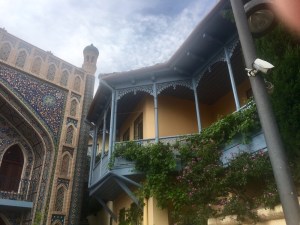 The Royal Bath House is the most ornate of the sulphur baths that are the main attraction of old town. We booked a bath and steam room for two– an hour for 40 GEL and a little extra for towels. A brisk splashdown and massage cost 20 GEL each. The bathrooms are covered with tiny tiles and ours was spotlessly clean. The salt in the water makes your legs float like barrage balloons and the water is very warm. We spent more time sitting on the stone bench by the shower than we did submerged. A woman gave me my personal massage–a bracing treatment during which she sloshed buckets of hot water at me and then scrubbed me sternly with a scouring pad. A quick wipe down with a wet cloth and an instruction to have both a hot and cold shower. A man provided Peter with the same. If they’d offered facials I would have had one. Exfoliated from shoulder bone to big toe, it feels odd to be left with a dirty face.