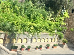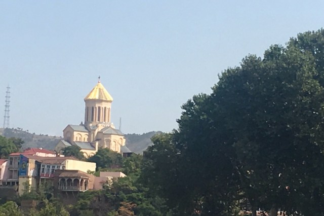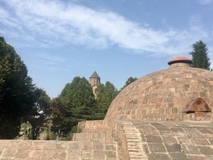 We walked down to Sioni Cathedral. Zion. But Sioni is pronounced See-oh-knee which you will need to know when you ask a taxi to drop you off there. (By the way, use Taxify– or be sure to proffer only 2 or 3 lari as a fare. We did not do this and were consistently and irritatingly ripped off.) The church has been rather overshadowed by the more showy Holy Trinity high above the city, but it is a beautiful, peaceful place. The courtyard has park benches for the weary, and a row of taps dispensing holy water. Georgian churches have taller, slimmer spires than those in Armenia which made them all look strangely out of scale to me.