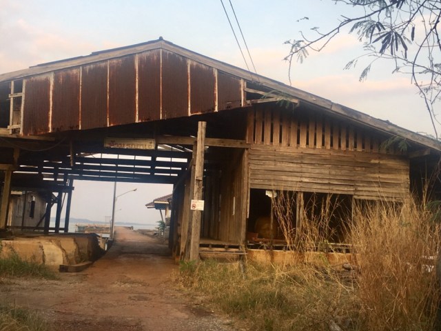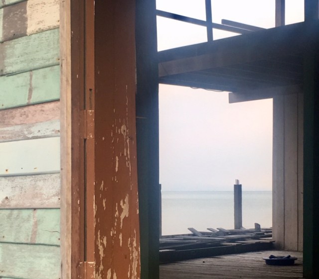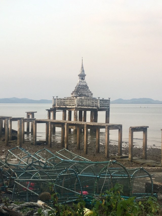 A tip-tilted seafood sign with an arrow could have been suggesting either of two directions. I walked on towards the water– tumble-down buildings on a disused pier, the remains of what might have been an old fish market, and a shrine in the water I thought was made from shells.