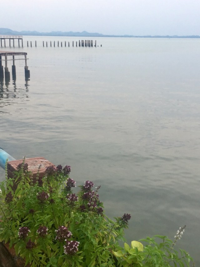 After about 15 minutes on the main road, I turned right towards the sea, walking past a large school painted bright blue, pink, orange and green. Lurid, but much more alluring than the grey concrete walls of many Western schools. A couple of little girls playing in the street shouted Hello after me, keen to show off their English. The road found a small river going down to the Gulf. The banks were lined with fishing detritus and a few small boats lolled in the almost still water. There was no one around.