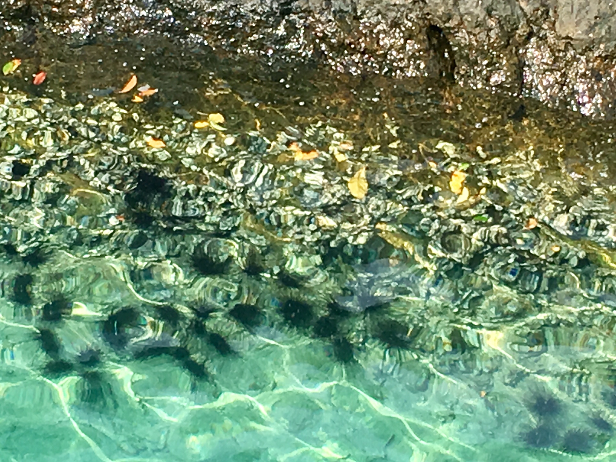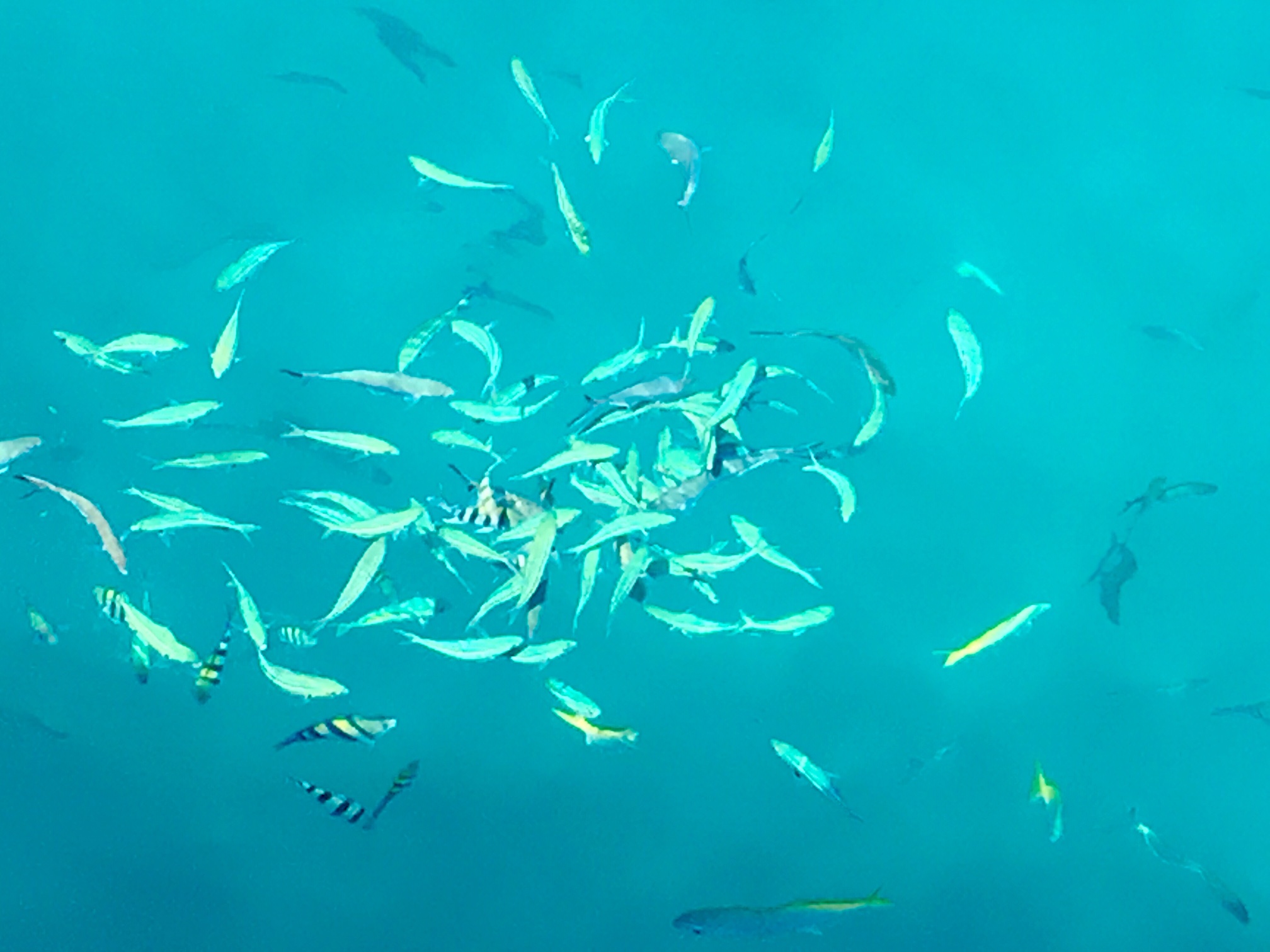The fish were blue with black stripes, and yellow with black stripes, or lit in neon colors. Shoals of small fish flurries around us like willow leaves, but in Autumn colors. The water was warm as a bath, and beautifully clear.