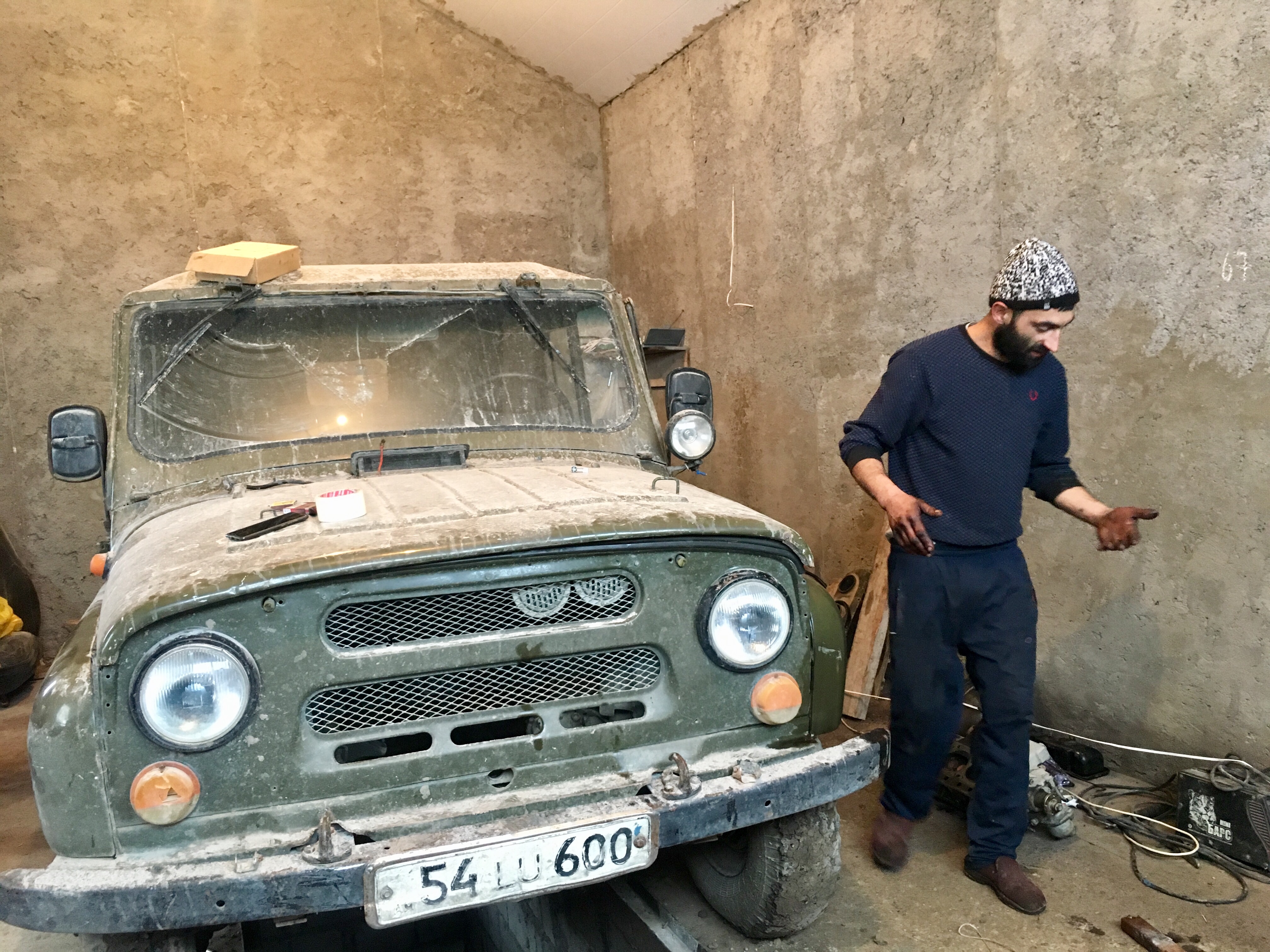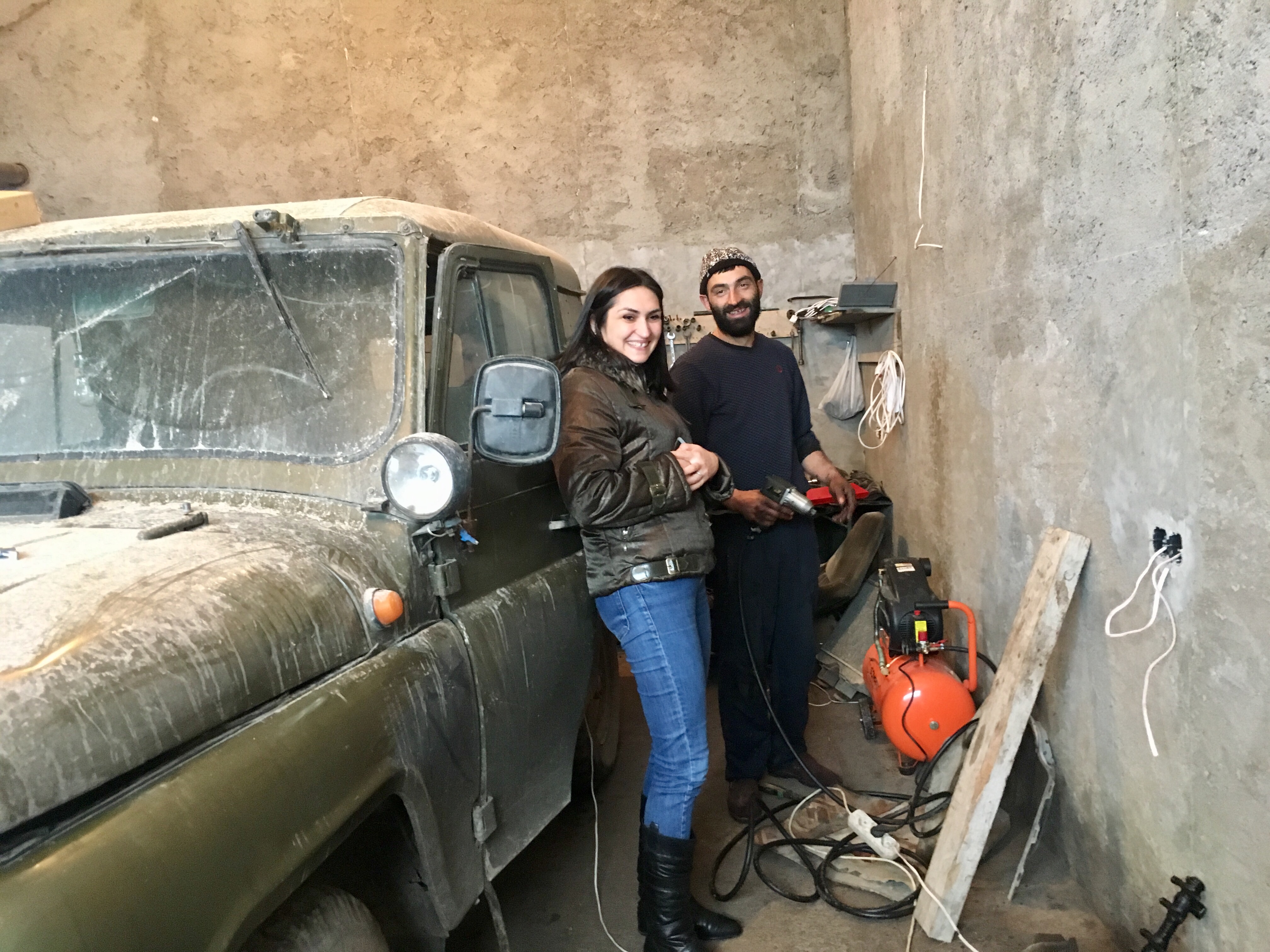 Roma, Rita’s son has actually only just moved back in. For most of his children’s lives he was working in Russia as a mechanic, sending home money every week to feed his family. Now, daring to hope that fortunes may change in Armenia, he and his dad have bought a plot of land, built a garage,and dug a mechanic’s pit. They did all this work themselves, so they have reason to be proud of it. We drove through the frozen mud to visit the garage ,and see Roma at work on a car for one of his first local customers. He didn’t have time to join us for lunch.