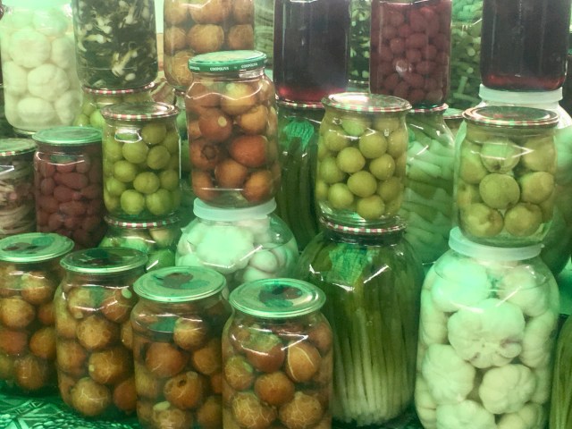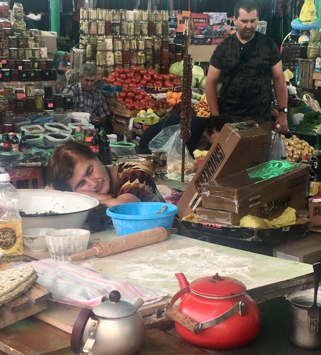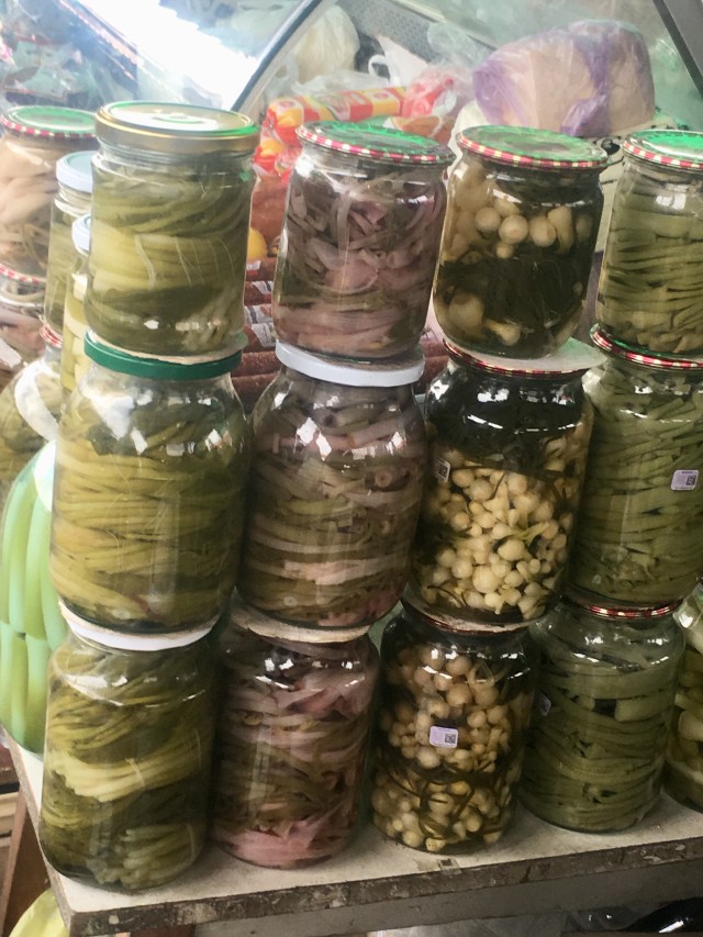 By this time we were at risk of monastery fatigue. Time to repair to the market at Shushi for some fresh made zhingalov hats and the chance to admire the pickling skills of local women. Zhingalov hats are flatbreads stuffed with a variety of herbs, fresh-picked in local fields. The bread is skillet-baked in front of you, and handed over while still warm. As you can see below, it is tiring and labor intensive work.