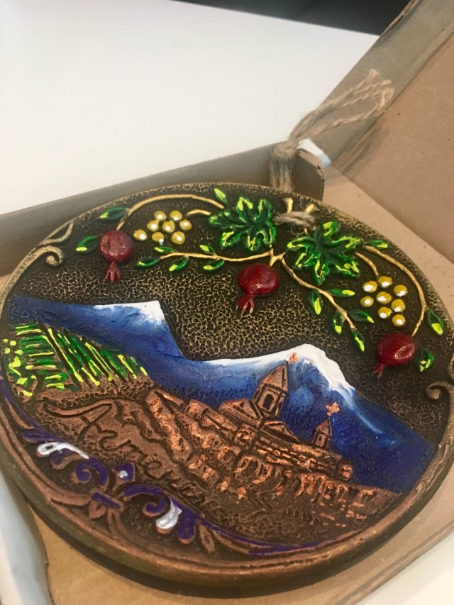 Downstairs to the bank machine, upstairs to the Aeroflot payment office, Gevorg encouraging my broken spirit every step of the way. He was standing in the check-in line ready to swap the baggage receipt for my ransomed boarding-card when Nane and her mother turned up. Nane is one of my poetry teens from Goris. She missed the chance to say goodbye there, but she and Knarik were in Yerevan today. They took a taxi to the airport to surprise me in the check-in line, and handover a terracotta plate commemorating my beloved Ararat. It is in my hand luggage.