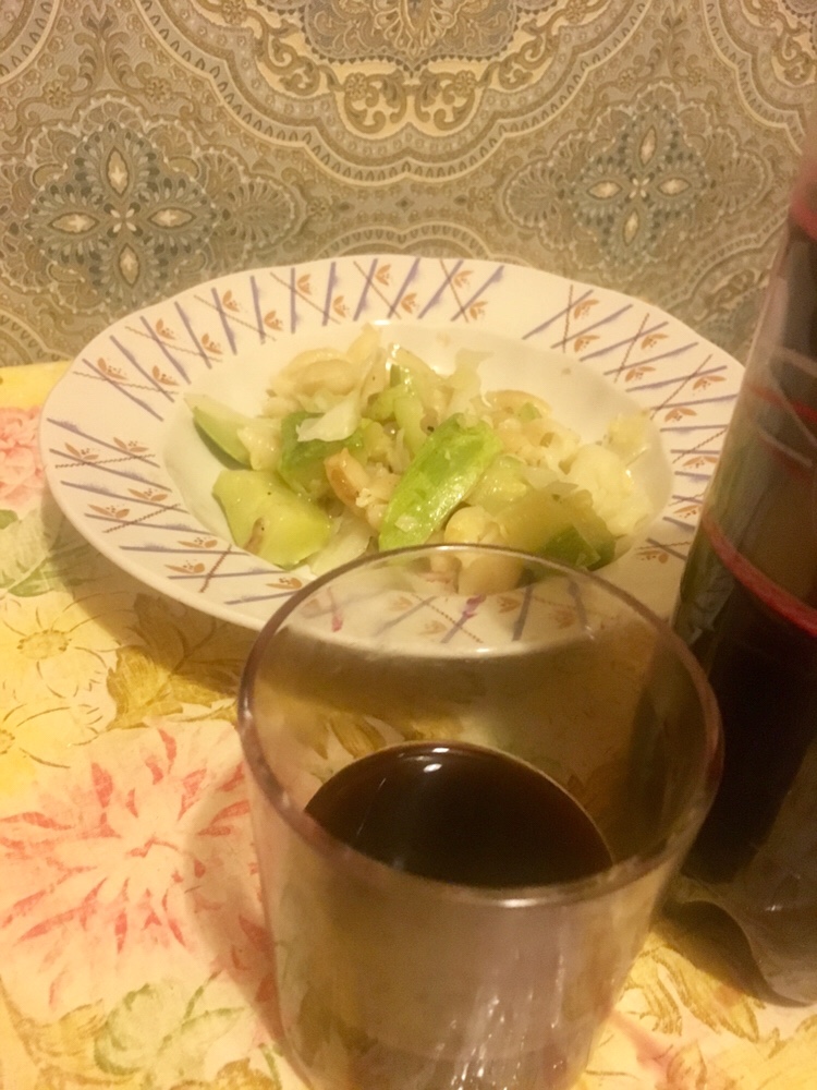I found a zucchini lurking in the fridge. I chopped it and the cabbage and threw them on top of a pot of pasta shells and boiling salted water. I chopped and fried an onion and some garlic and added them to the drained pasta and steamed vegetables. I even managed to squeeze the last of the sweet chili sauce out of a care package bottle.